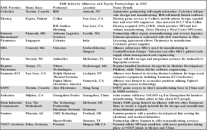 Still, acquisitions are not the only way to go. An alternative is alliances and equity partnerships, and they gained popularity in 2003. EMS providers entered into 16 of these arrangements last year, compared with around nine in 2002. In these cases, an EMS provider typically gained through its partner a capability that the provider lacked. Alliances and equity partnerships in 2003 addressed needs such as access to technology, design expertise, service capabilities, and manufacturing locations (see last table below).