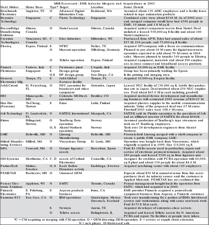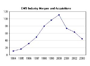 Reflecting the overall decline in transactions last year, the largest number of deals closed in 2003 by any provider was three, and three providers reached this total. Only one of these was a tier-one player. In contrast, three EMS companies, all from the top tier, completed seven or more acquisitions the year before.