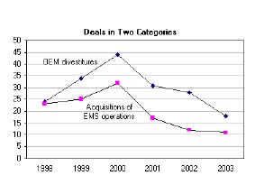 For 2003, providers made 18 acquisitions of assets divested by OEMs. (These deals are designated “O” on the Scorecard.) OEM divestitures declined by 36% from 28 the year before (see chart below). The bulk of these 2003 deals involved manufacturing operations, but providers also bought OEM assets in design, mechanics, logistics and asset recovery. As in 2002, these OEM deals accounted for the largest number of transactions in 2003.