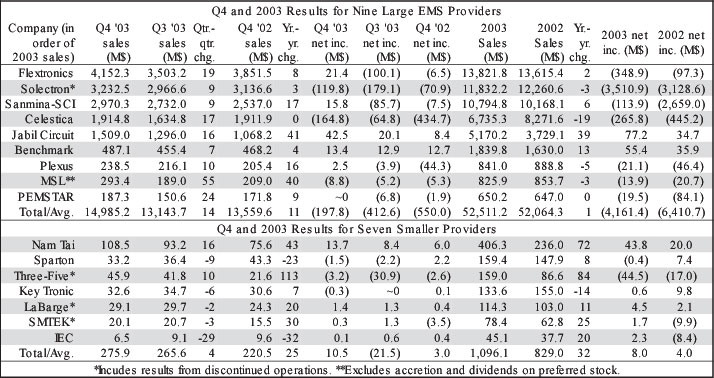 Correction for the record… In the November 2003 table of Q3 results (p. 7), Three-Five Systems was listed with net income of $30.9 million, which was in error. The company actually reported a net loss of $30.9 million for Q3 2003. As a result, the total net income shown for 11 smaller providers in Q3 was incorrect. As a whole, this group actually produced a net loss of $29.7 million in Q3.