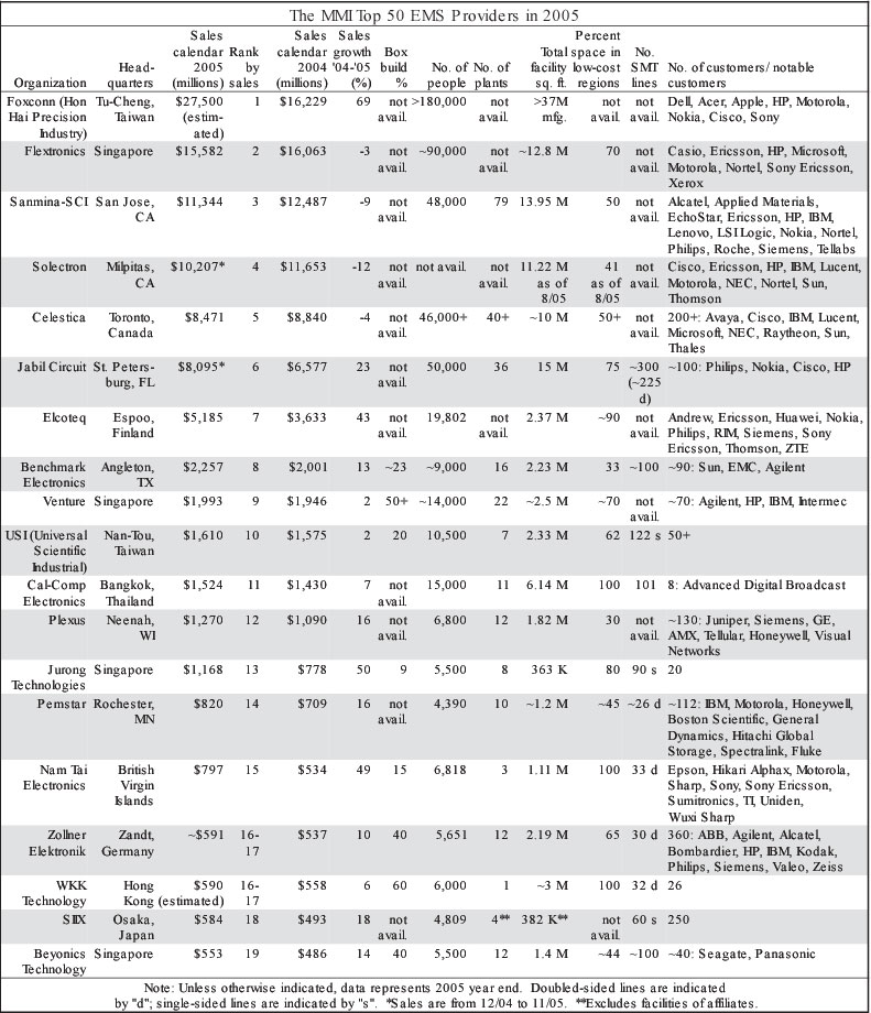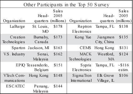 Flextronics, which barely lost the 2004 sales contest to Hon Hai (May 2005, p. 1), took a firm hold on second place in the 2005 Top 50. The order of providers in the remaining top-10 positions was unchanged from 2004. Top-10 revenue represented 84.5% of the Top 50’s sales.