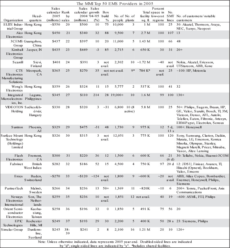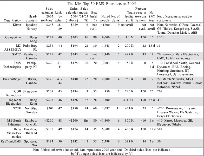 Seven providers who were not on the 2004 list joined the 2005 Top 50. Four are Asia-based, and they consist of Cal-Comp Electronics; Hana Microelectronics; Integrated Microelectronics, Inc.; and Topscom Electronics. The remaining three Enics, Kitron and NOTE hail from Europe. Hana had appeared in some 1990s-era Top 50 lists, but the rest are being ranked for the first time.