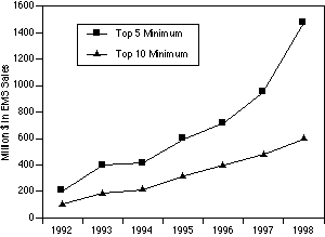 OEMs who focus on the Top 50's upper echelon will find one new member of the top five and two additions to the top 10, as ranked by EMS sales for calendar 1998. While SCI Systems, Solectron and Celestica remained one, two and three respectively in 1998, as in 1997, Flextronics International moved up one spot to fourth largest provider. Rounding out the top five was NatSteel Electronics Ltd., which edged out Jabil Circuit for the fifth position. Two new members of the 1998 top ten were Sanmina at number nine and Taiwan's Universal Scientific Industrial Co. ranked tenth. The cut-offs for making both the top 10 and top 5 have increased every year since 1992 (see chart below).