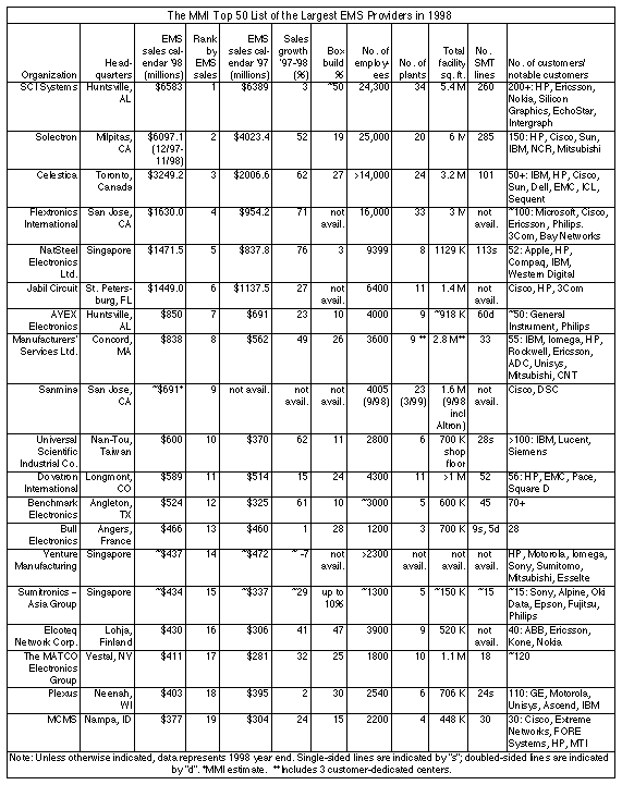 Some financial results...For the fiscal Q2 ended Feb. 26, Solectron posted sales of $1.91 billion, up 61% from the prior Q2. Net income for the quarter increased 34% from the year-earlier period to $65.5 million. Q2 diluted EPS came in at $0.26 versus $0.20 for Q2 fiscal 1998. Six-month revenues rose 66% year-over-year to $3.85 billion, while net income was up 38% to $129.4 million. Solectron set Mar. 3 as the redemption date for about $230 million in convertible subordinated notes....NatSteel Electronics Ltd. (Singapore) reported sales doubled from S$1.23 billion in 1997 to S$2.46 billion in 1998, while net profit after tax went up by 90% to S$68.6 million. On a U.S.-dollar basis, the percentage increase in sales was not quite as high (see the MMI Top 50, p. 2). According to Bloomberg News, Apple accounted for 37% of sales....ACT Manufacturing (Hudson, MA) showed Q4 1998 net income of $1.5 million versus a net loss of $10.4 million a year earlier. Q4 sales increased 28% to $76.5 million. Net income for 1998 was $1.3 million compared with a net loss of $4.0 million in 1997. Gross margin rose to 9.7% in Q4 from 7.4% in Q3....For fiscal Q2 ended Jan. 31, sales of CMC Industries (Santa Clara, CA) decreased to $74.6 million from $88.4 million in the year-earlier quarter. Net income was $44,000, compared with $1.2 million in the prior Q2. The company was pleased to return to profitability in the quarter. Sales for Q2 and the first half of fiscal 1999 were lower due to an "insourcing" decision made by a box-build customer in fiscal 1998....Primetech Electronics (Montreal, Canada) posted sales of Cdn$22.6 million for its fiscal Q1 ended Dec. 31, 1998, compared with Cdn$22.3 million in the year-earlier quarter. Net income from continuing operations amounted to Cdn$2.5 million, down by Cdn$0.1 million from a year earlier. The provider had to offset lost revenue from a peripherals program that represented 24% of sales in Q1 fiscal 1998 and ended in March 1998. Primetech is seeing a high level of new product introductions, with about 80 designs planned for fiscal Q2 versus 54 new designs produced in Q1. In contrast, the company had 26 new products going through preproduction in the first half of fiscal 1998....Bell Microproducts' Quadrus Manufacturing division (San Jose, CA), which participated in the MMI Top 50 survey, reports EMS sales increased 18% from $73 million in 1997 to $87 million in 1998. Although Quadrus experienced a Q4 and full-year operating loss, during the year it reduced operating expenses as a percentage of sales, improved yields and added new customers. Among Quadrus' 24 customers are Cisco Systems, Lucent Technologies, Elec-tronics for Imaging, Avid-Digidesign, and Cabletron-Flowpoint.