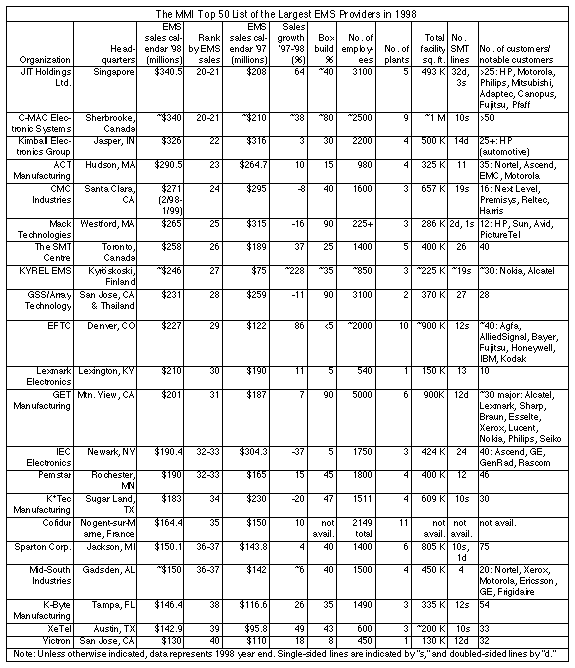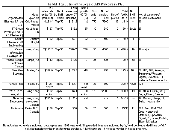 Changes also occurred in the Top 50, as nine companies were added for 1998. They were (in alphabetical order): Aimtronics, C-MAC Electronic Systems, KYREL EMS, Lexmark Electronics, Ocean Information Holdings Ltd., Pemstar, Sparton Corp., Sumitronics-Asia Group and WKK Technology Ltd. KYREL EMS and WKK are returnees from the 1996 list. Of the nine additions, six are based outside the U.S., indicating the international makeup of the MMI Top 50.
